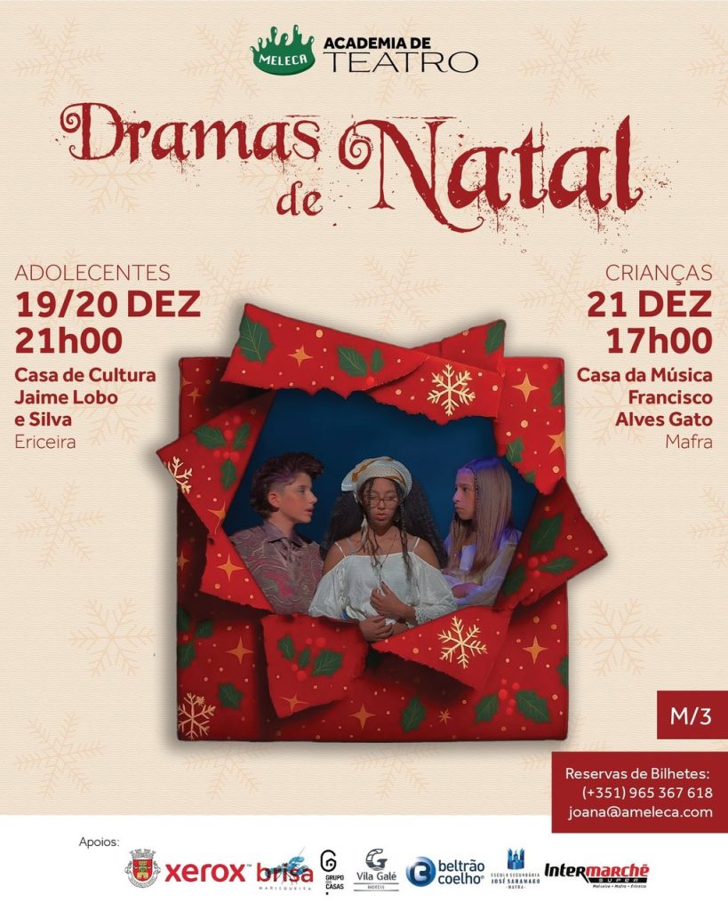 A peça “Dramas de Natal” é apresentada ao público jovem, nos dias 19 e 20 de dezembro, às 21h00, na Casa de Cultura Jaime Lobo e Silva (Ericeira). Já o teatro infantil vai a cena no dia 21, pelas 17h00, na Casa da Música Francisco Alves Gato (Mafra).