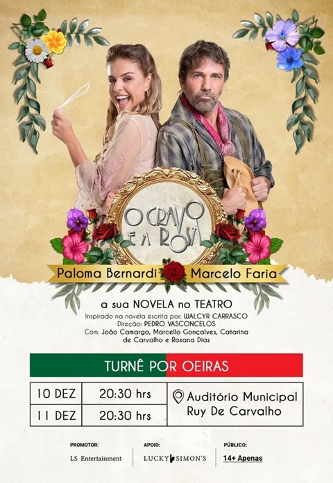 É já esta quarta e quinta-feira que o Auditório Municipal Ruy de Carvalho, em Carnaxide, recebe a turnê portuguesa do clássico da TV brasileira para o teatro "O Cravo e a Rosa"! Sessões arrancam às 20h30. Uma noite. Uma história. Uma experiência única.
